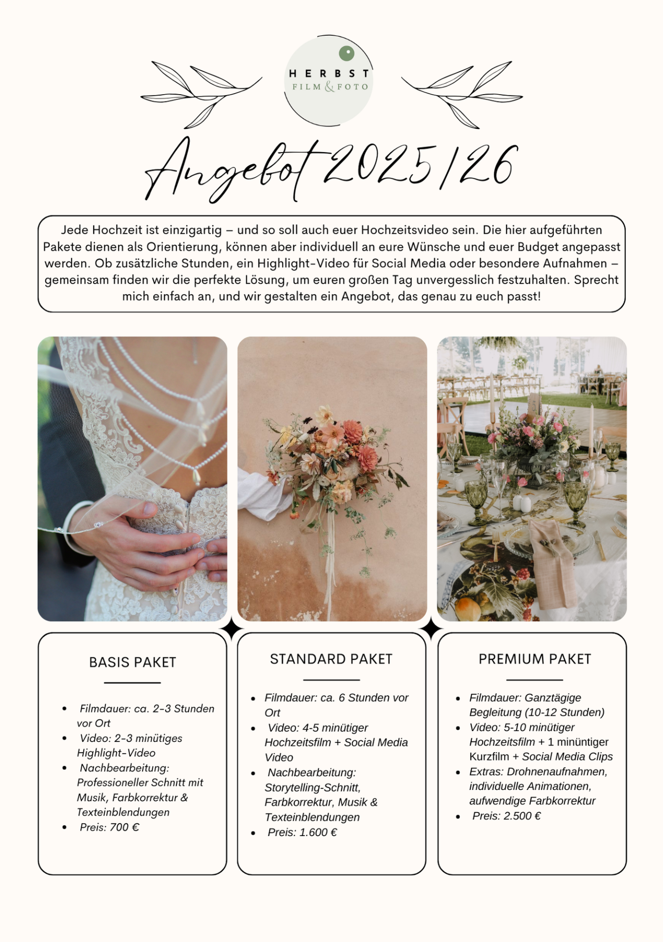Die Preise bei anderen Video- und Fotoprojekten sind sehr individuell und vom Aufwand abhängig, den man meist erst nach einer kurzen Besprechung der gewünschten Dienstleistung abschätzen kann. Sendet mir daher gerne eine Anfrage!